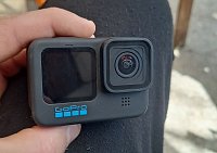 GoPro Hero 11 Black s příslušenstvím na helmu a karta