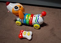 Na hřbetě pejska je mini centrum aktivit s pěti barevnými tlačítky, která slouží jako klávesy piana. Dítě si může skládat melodie nebo aktivovat světelné a zvukové efekty.