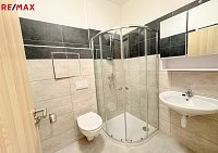 V koupelně je prostorný sprchový kout, umyvadlo a WC.